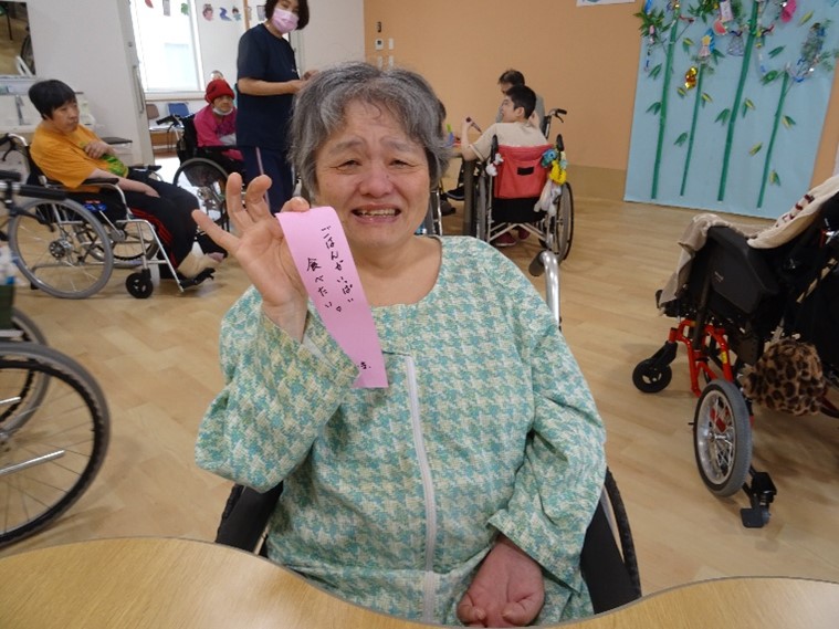 7月は七夕の行事を行っています。色とりどりの短冊には、利用者様のそれぞれの願い事が書かれ、笹の葉の特大イラストに飾り付けられました。午後にはクリームやフルーツで彩られた水羊羹をお茶菓子として召し上がられています。