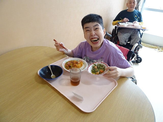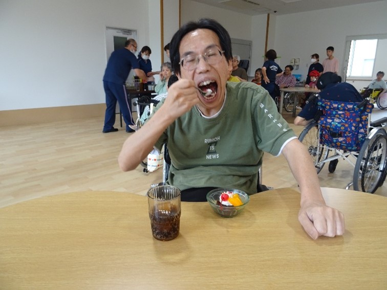 9月は感染症の勢いも治まり、小星園も普段の生活が戻ってきました。慎重に様子を見ながらですが年中行事を再開しています。今回紹介するのは“ミニ納涼祭”の様子です。数年前までは地域の方々を招いて盛大に行われていた納涼祭ですが、天候による利用者様の健康や安全への配慮から規模を縮小して開催しています。今年も集まっての遊技等の実施は難しい状況ですが、食事ではお祭りメニューを楽しまれています。