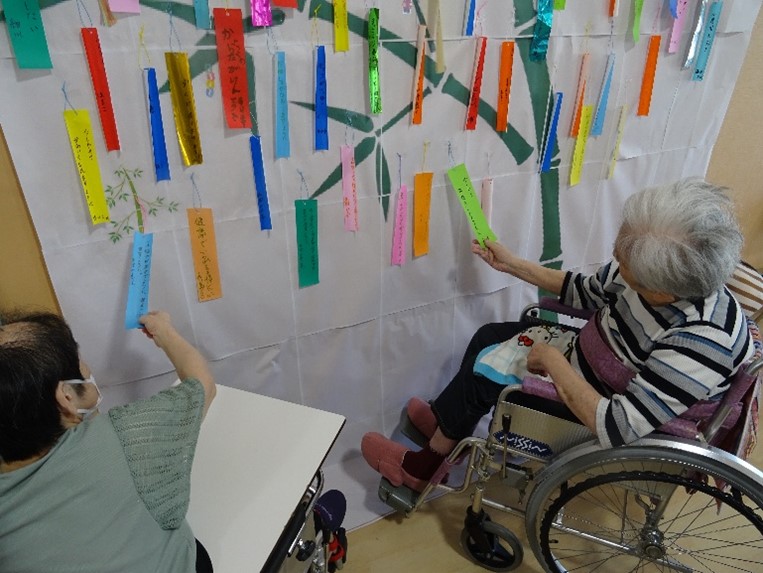 7月の主な行事は七夕でした。利用者様と一緒にウォールアートを作成しています。とても可愛く食堂壁面が彩られ、大好評でした。また、それぞれの願いを込め短冊も笹に吊るしています。澄んだ夏の空に、みなさまの願いがが届きますように。当日食事は、栄養士厨房スタッフが腕を振るい、天の川のような美しい散らし素麺とお菓子を提供しています。とても涼しげで楽しく召し上がられています。