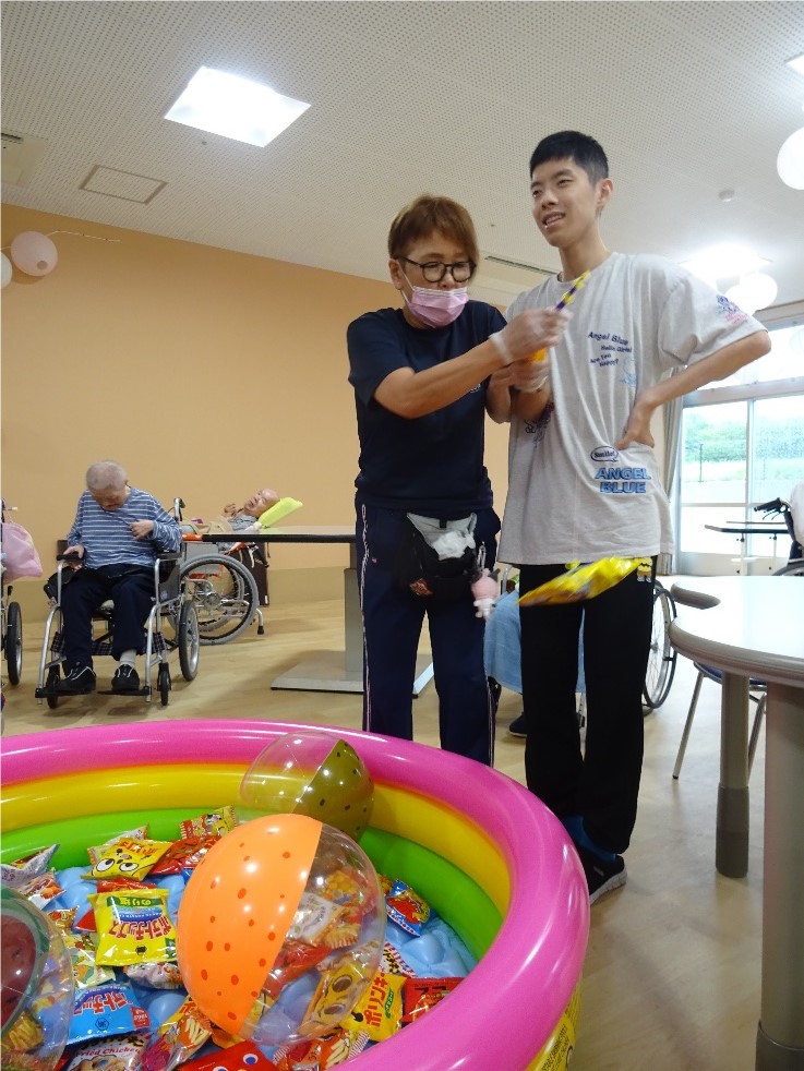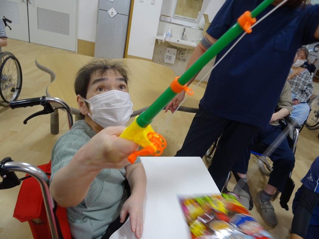 8月は納涼祭を兼ねて喫茶室も催しています。 ビニールプールを縁日の屋台に見立て、釣りのレクリエーションをしています。 午後にはかき氷も提供され夏の雰囲気と一時の涼を楽しまれました。
