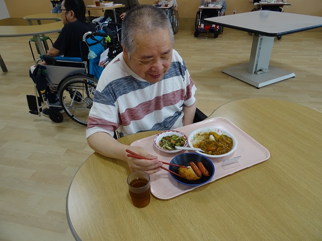 9月はカレーフェスの行事を行っています。トンカツ、ソーセージ、エビフライのトッピングにビーフカレー、キーマカレー、バターチキンカレーとカレーの種類を選べる仕様で利用者様それぞれのスペシャルカレーを楽しみました。 厨房スタッフによる絶品揃いでしたがビーフカレーが人気だったようです。今後も選ぶ楽しみの機会を設けていきます