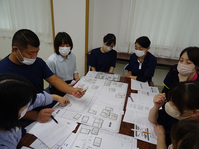 10月は防災訓練を行っています。施設が災害時に地域の避難所に指定されていることもあり避難所運営ゲーム (hug-ハグ)を使って災害を想定し、避難所運営について学びました。 また、避難経路の確認や車椅子利用者の避難誘導に重点を置いて実施しています。防災知識を学び、再確認もする事で職員は普段の業務では気づきにくいリスクや、介助時の困難さを体験的に理解することができました。 また利用者様との行事ではハロウィン行事として利用者様によるアート作品制作が行われ、食堂に展示しています。とても好評でした。